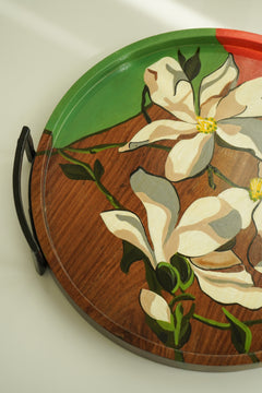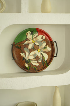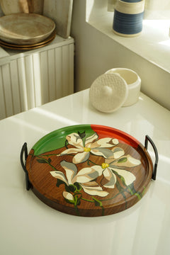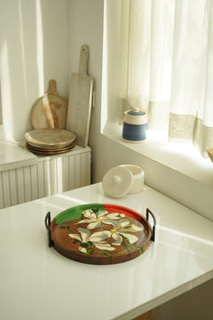 The "Versatile Elegance Tray" is a sophisticated fusion of modern design and timeless beauty, crafted from rich premium wood. The tray features a striking hand-painted floral motif, with soft ivory blossoms contrasted against vibrant hues of green and red. The minimalist yet bold design captures the essence of natural elegance, making it a versatile piece that effortlessly complements both contemporary and traditional interiors.With its sturdy black handles and polished finish, the "Versatile Elegance Tray" is not only a practical serving piece but also a stunning decorative accent that adds a touch of refined style to any space. Whether used for serving guests or as a centrepiece, this tray exudes understated luxury and adaptable charm.