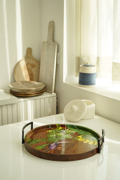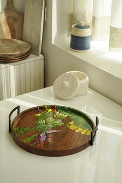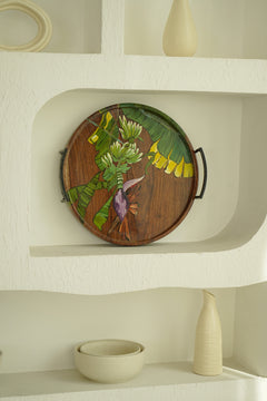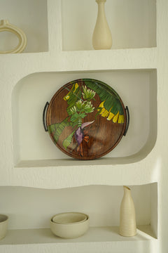 Our "Enchanted Serenity Tray" captures the gentle elegance of hand-painted premium wood adorned with a delicate banana leaf motif and a sophisticated purple-hued flower bud. This design blends nature's tranquility with refined artistry, creating a piece that exudes both beauty and grace. The soft colors and intricate details offer a serene touch to any space, making it a perfect choice for those who appreciate timeless elegance and artistic craftsmanship. Let this piece be a part of your home decor and serving experience and see the magic it creates!