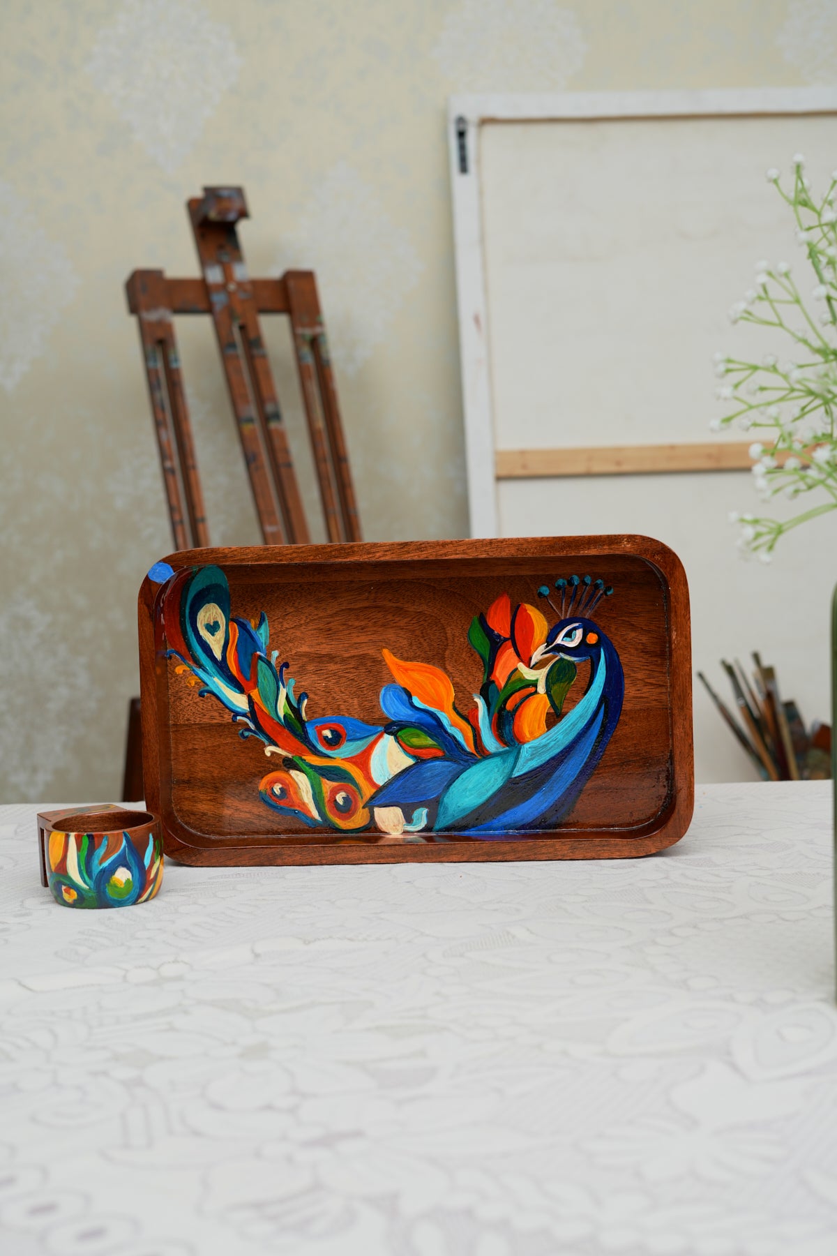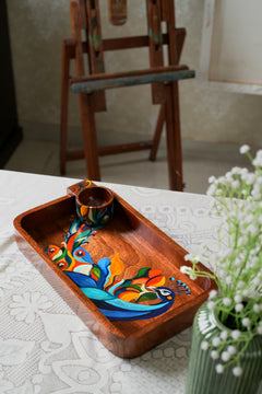 Elevate your serving experience with the Peacock Dip And Serve Platter. Handcrafted from durable wood and adorned with delicate hand-painted designs, this tray comes with a thoughtfully carved space to hold a dip dish—making it perfect for serving snacks, appetizers, fruits, or cheese with your favorite chutney, salsa, or sauces.