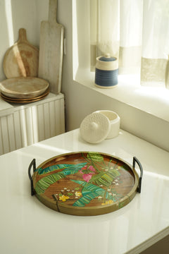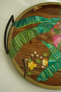 The "Ceremonial Blossom Tray" is a masterful hand-painted premium wood creation that combines the elegance of banana leaves with a vibrant display of pink and yellow flowers. Banana leaves, revered for their symbolism of prosperity and renewal, frame the lush, intricate floral patterns, adding depth and cultural richness to the design. The soft, sophisticated hues of the flowers, paired with the natural warmth of the wood, create a harmonious and gentle aesthetic. This piece offers a tranquil and refined touch to any environment, transforming any space into a serene retreat with its captivating charm.