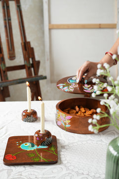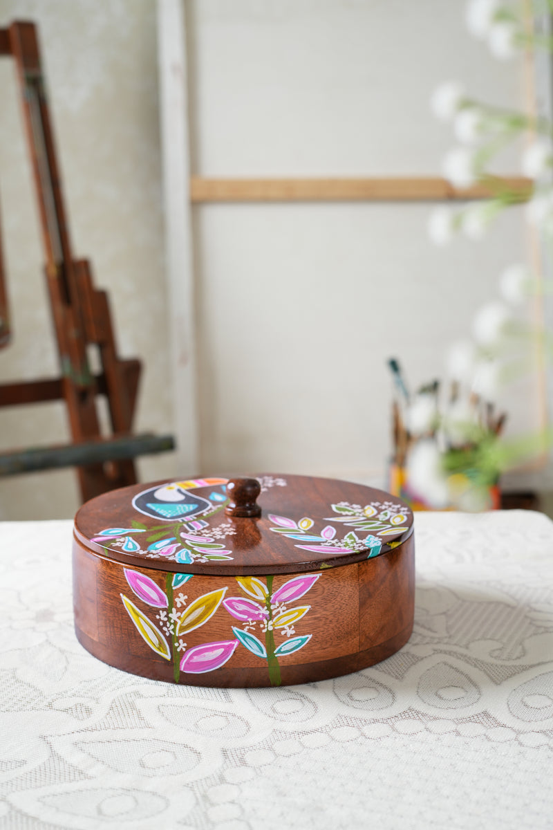 Crafted from durable, high-quality wood, this casserole is designed for both beauty and functionality. Perfect for serving snacks, fruits, or condiments, it also works as a decorative piece when not in use. Its smooth finish and intricate hand-painted details make it a charming addition to any home or a thoughtful, artistic gift.