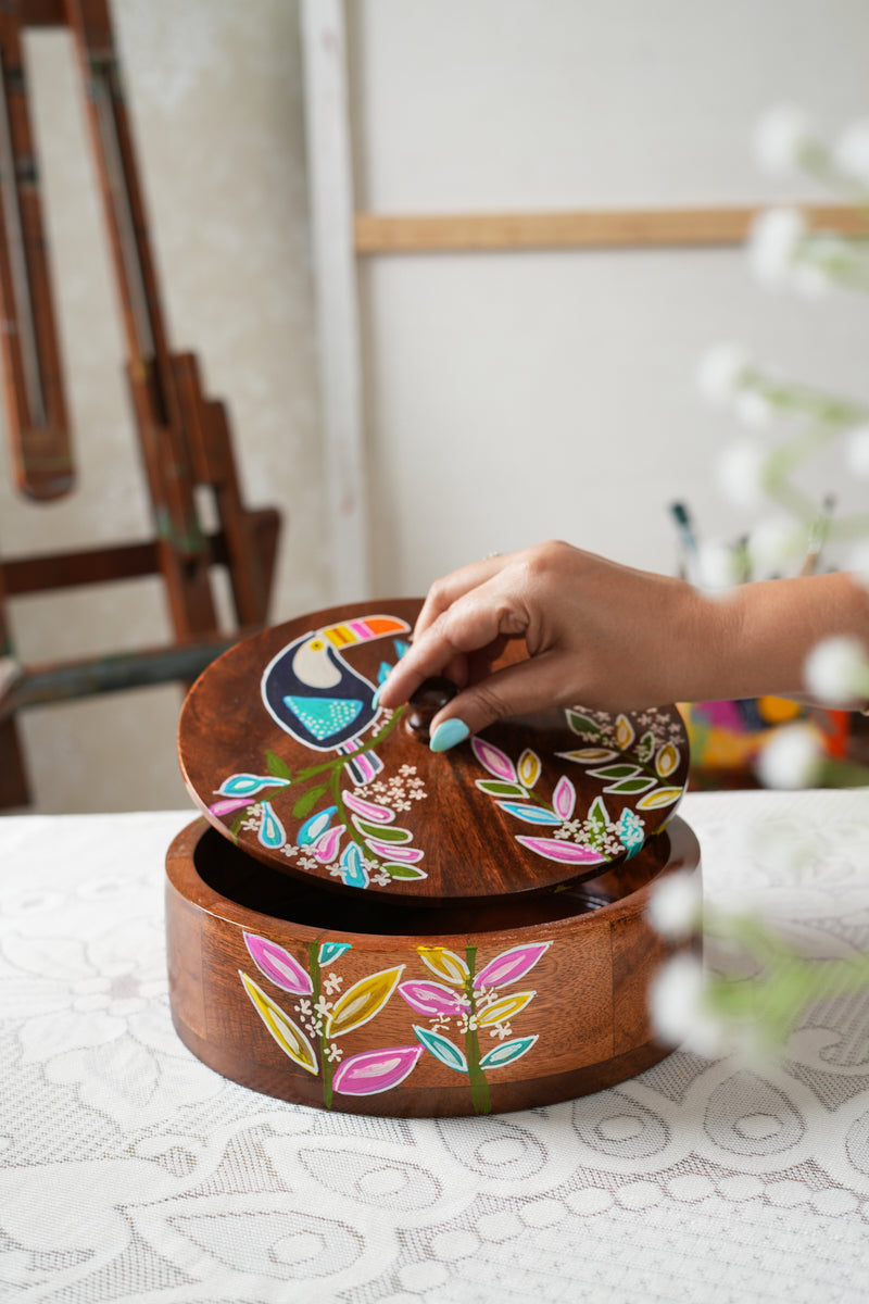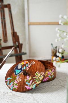 Bring a splash of tropical charm to your dining table with this hand-painted wooden Tropical Delight Casserole, featuring vibrant flowers and a colorful toucan. Each piece is carefully painted by hand, making every casserole truly unique. The bright floral patterns combined with the playful toucan create a lively and cheerful centerpiece for your kitchen or dining décor.