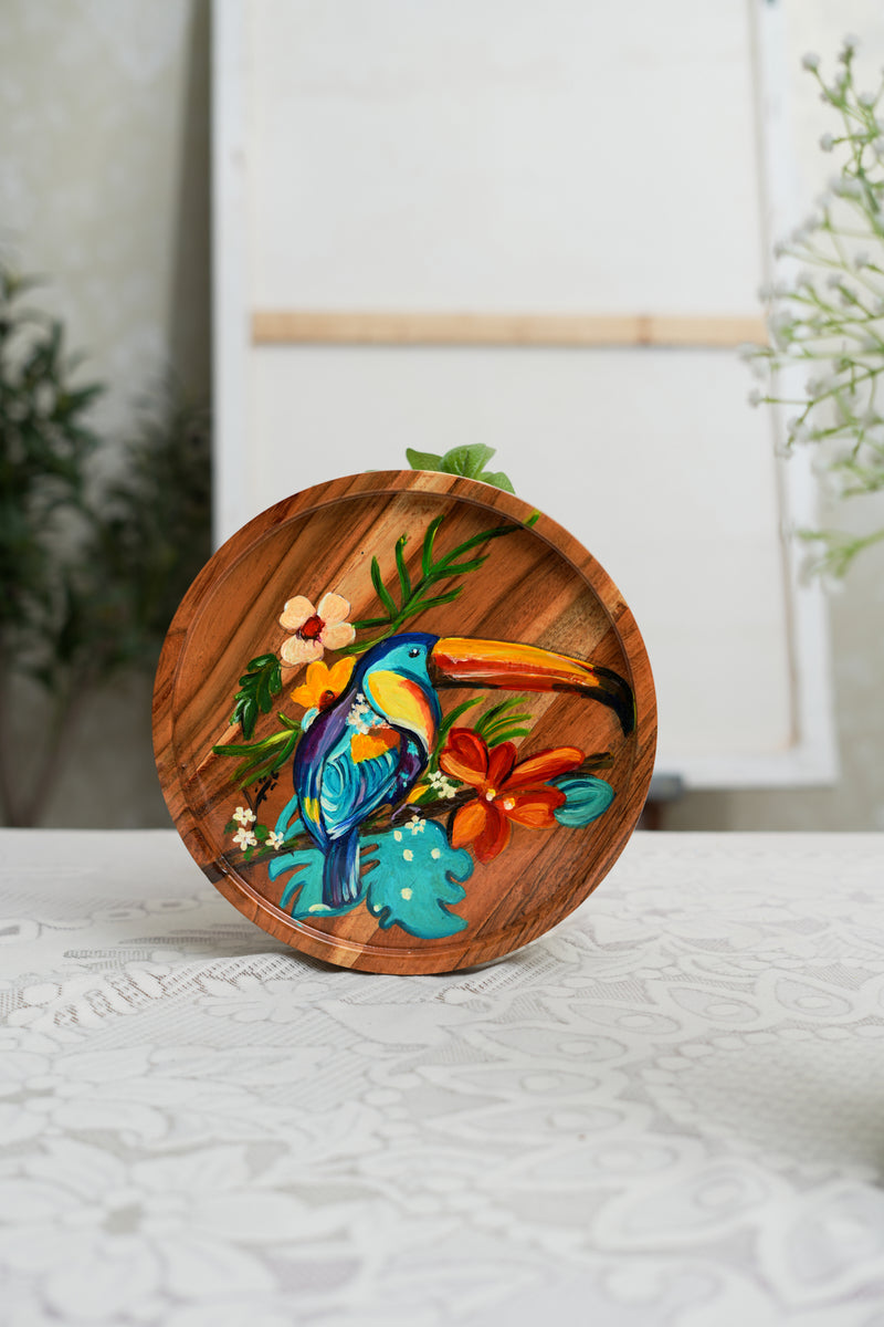 Crafted from durable wood, this tray is perfect for keeping your jewelry, keys, coins, or small essentials neatly organized. The playful toucan and bright floral details create a cheerful, tropical vibe, making it both a functional and decorative addition to your bedside, dressing table, or workspace. A thoughtful gift for nature and art lovers alike.