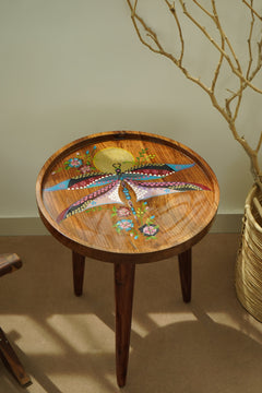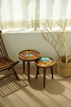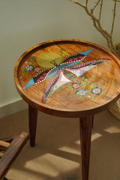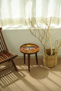 This is the "Dragonfly Reverie Table" – a stunning hand-painted premium wood masterpiece that embodies the essence of courage, strength, happiness, transformation, and spiritual growth. Each intricate dragonfly design is meticulously crafted to capture the ethereal beauty and symbolic power of this enchanting creature. Perfect for adding a touch of artistic elegance to your home, this table is not just a piece of furniture but a statement of inspiration and serenity. Transform your space with the "Dragonfly Reverie Table" and let its symbolic grace uplift and enchant your everyday living.